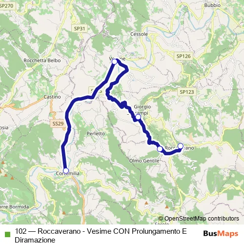 The first stop of the 102 bus route is Roccaverano - Paese and the last stop is Monastero Bormida. 102 (Roccaverano - Vesime CON Prolungamento E Diramazione) is operational during tutti i giorni.