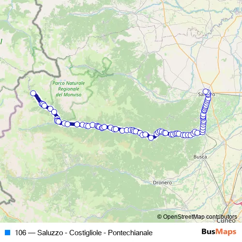 The first stop of the 106 bus route is Pontechianale - Pontechianale and the last stop is Saluzzo - Saluzzo Autostazione. 106 (Saluzzo - Costigliole - Pontechianale) is operational during tutti i giorni.