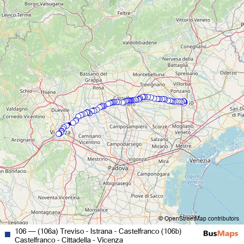 The first stop of the 106 bus route is Treviso Autostazione and the last stop is Vicenza. 106 ((106a) Treviso - Istrana - Castelfranco (106b) Castelfranco - Cittadella - Vicenza) is operational during tutti i giorni.