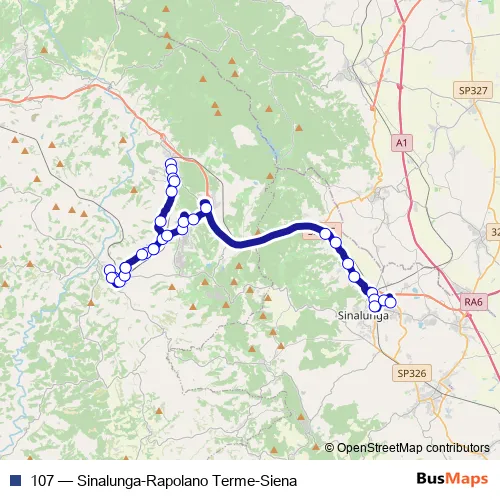 The first stop of the 107 bus route is Rapolano-P.Zza Della Repubblica and the last stop is Sinalunga V. Turati. 107 (Sinalunga-Rapolano Terme-Siena) is operational during tutti i giorni.