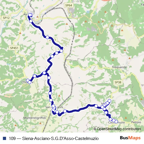 The first stop of the 109 bus route is Castelmuzio and the last stop is Asciano Carabinieri. 109 (Siena-Asciano-S.G.D'Asso-Castelmuzio) is operational during tutti i giorni.