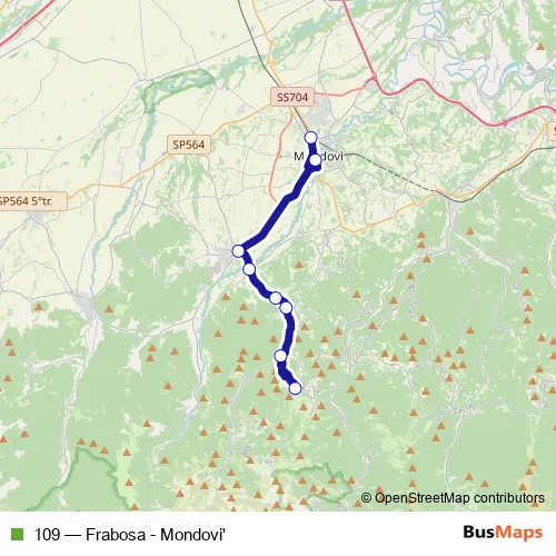 The first stop of the 109 bus route is Frabosa Soprana - Piazza Marconi and the last stop is Annunziata - Bivio Frabosa. 109 (Frabosa - Mondovi') is operational during tutti i giorni.