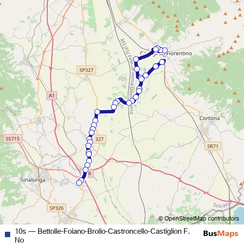 The first stop of the 10s bus route is Castiglion F.No Piazza Garibaldi and the last stop is Bettolle Piazza Del Popolo. 10s (Bettolle-Foiano-Brolio-Castroncello-Castiglion F.No) is operational during tutti i giorni.