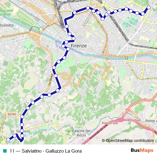 The first stop of the 11 bus route is La Gora and the last stop is Salviatino. 11 (Salviatino - Galluzzo La Gora) is operational during tutti i giorni.