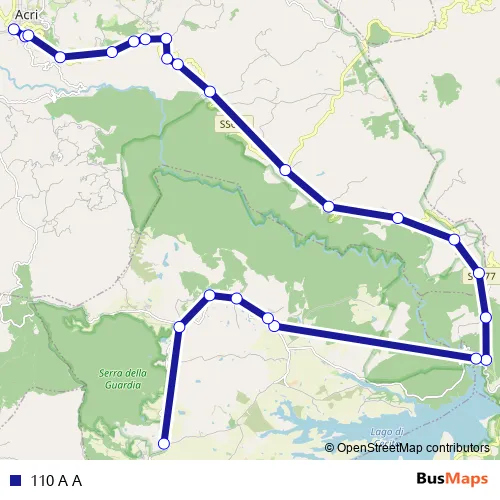 The first stop of the 110 A A bus route is Via Socrate, 3 - Acri and the last stop is Strada Provinciale 247 - Celico. 110 A A is operational during tutti i giorni.