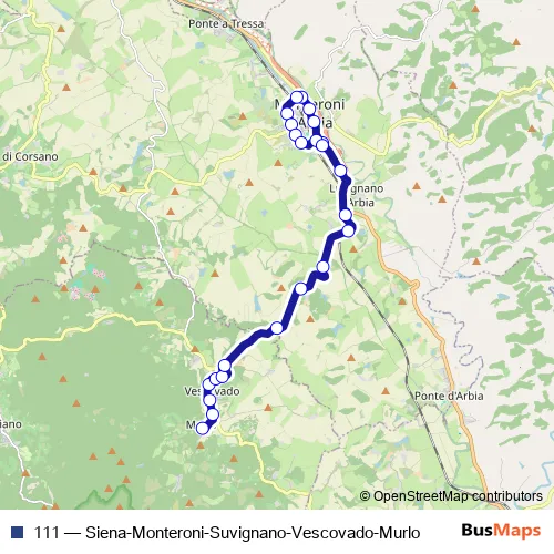 The first stop of the 111 bus route is Murlo and the last stop is Monteroni - Via Garibialdi. 111 (Siena-Monteroni-Suvignano-Vescovado-Murlo) is operational during tutti i giorni.