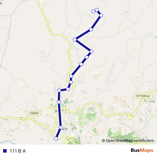 The first stop of the 111 B A bus route is Via Socrate, 3 - Acri and the last stop is Contrada Sant'Angelo, 150 - Acri. 111 B A is operational during tutti i giorni.