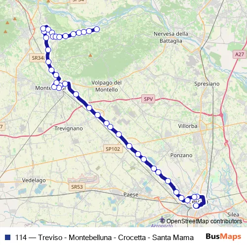 The first stop of the 114 bus route is Treviso Autostazione and the last stop is Santa Mama. 114 (Treviso - Montebelluna - Crocetta - Santa Mama) is operational during tutti i giorni.