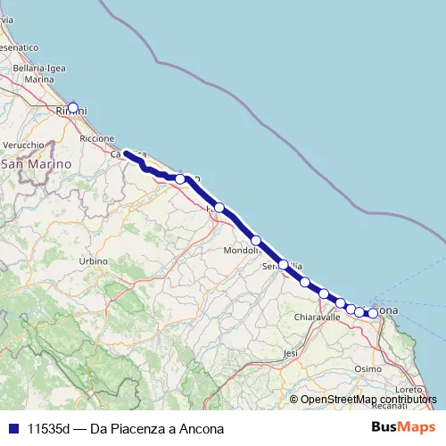 The first stop of the 11535d rail route is Rimini and the last stop is Ancona. 11535d (Da Piacenza a Ancona) is operational during tutti i giorni.