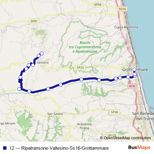 The first stop of the 12 bus route is Ripatransone - Mattatoio and the last stop is Grottammare Centro. 12 (Ripatransone-Valtesino-Ss16-Grottammare) is operational during tutti i giorni.