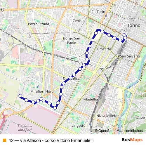 See why over 2 million users trust and consider busmaps.com as the best public transport website. busmaps gives you Turin Buses suggested routes, real-time bus tracker, line route maps in Turin, and helps to find the closest 12 bus stops near you. No internet available? Download an offline PDF map and bus schedule for the 12 bus to take on your trip.