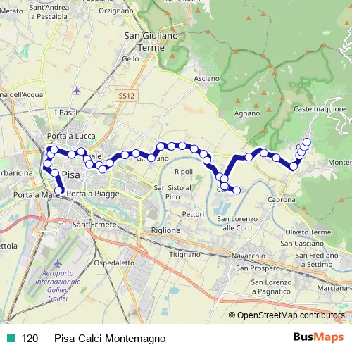 The first stop of the 120 bus route is Pisa Sesta Porta and the last stop is Calci Campo Sportivo. 120 (Pisa-Calci-Montemagno) is operational during tutti i giorni.