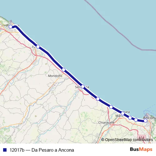 The first stop of the 12017b rail route is Pesaro and the last stop is Ancona. 12017b (Da Pesaro a Ancona) is operational during tutti i giorni.