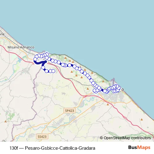 The first stop of the 130f bus route is Pesaro Stazione (Bus+Fs) and the last stop is Mancini (Gradara). 130f (Pesaro-Gsbicce-Cattolica-Gradara) is operational during tutti i giorni.