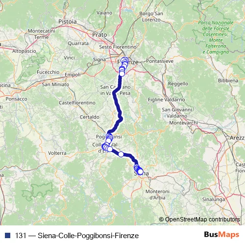 The first stop of the 131 bus route is Firenze Autostazione and the last stop is Siena-Via Tozzi. 131 (Siena-Colle-Poggibonsi-Firenze) is operational during tutti i giorni.