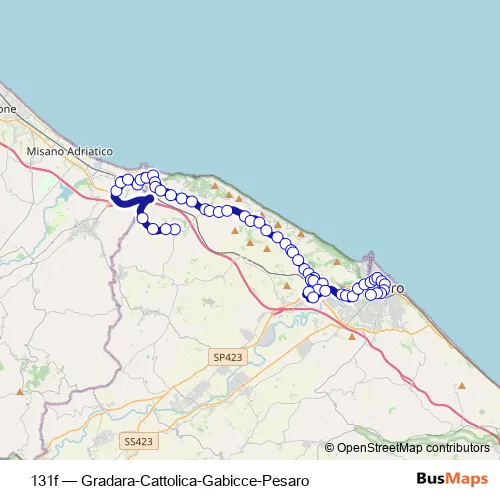 The first stop of the 131f bus route is Mancini (Gradara) and the last stop is Pesaro Stazione (Bus+Fs). 131f (Gradara-Cattolica-Gabicce-Pesaro) is operational during tutti i giorni.
