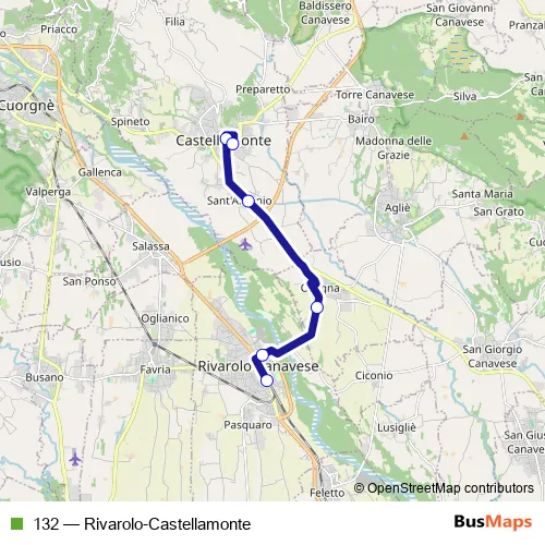 The first stop of the 132 bus route is Rivarolo Canavese - Stazione - Piazza Zanotti and the last stop is Castellamonte - Stazione Ferroviaria. 132 (Rivarolo-Castellamonte) is operational during tutti i giorni.