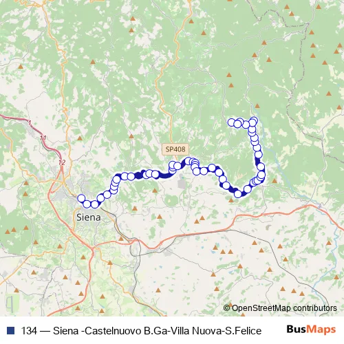 The first stop of the 134 bus route is Autostazione [1] and the last stop is Villa A Sesta. 134 (Siena -Castelnuovo B.Ga-Villa Nuova-S.Felice) is operational during tutti i giorni.