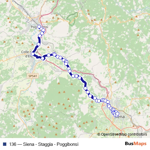 The first stop of the 136 bus route is Poggibonsi Fs [2] and the last stop is Siena-Via Tozzi. 136 (Siena - Staggia - Poggibonsi) is operational during tutti i giorni.