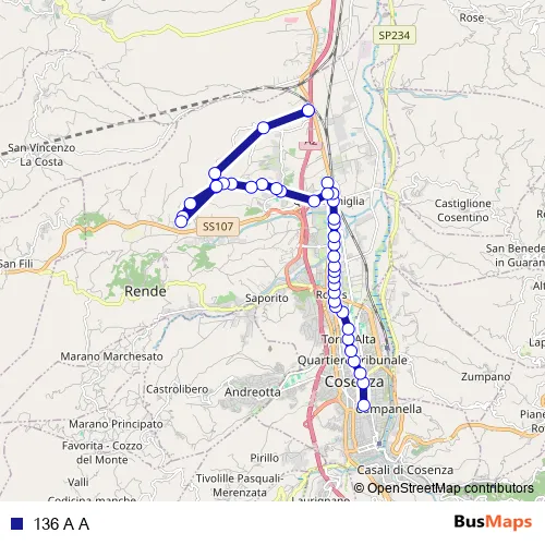 The first stop of the 136 A A bus route is Autostazione Cosenza - Cosenza and the last stop is Via Alessandro Magno - Rende. 136 A A is operational during tutti i giorni.