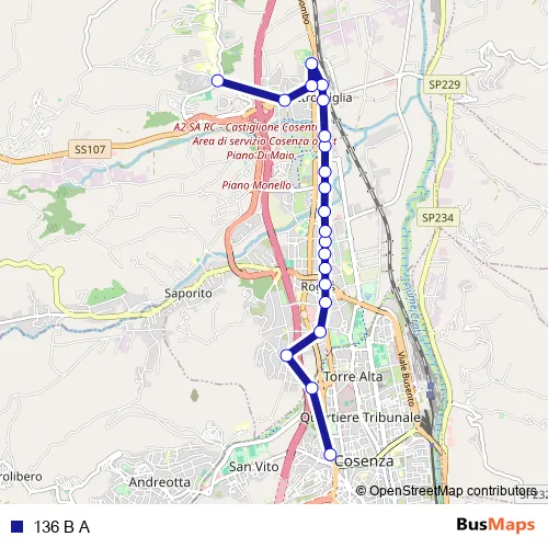 The first stop of the 136 B A bus route is Viale Guglielmo Marconi, 120 - Cosenza and the last stop is Università della Calabria - Arcavacata - Rende. 136 B A is operational during tutti i giorni.