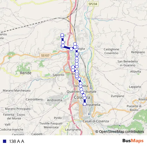 The first stop of the 138 A A bus route is Autostazione Cosenza - Cosenza and the last stop is Via Settimio Severo, 83 - Rende. 138 A A is operational during tutti i giorni.