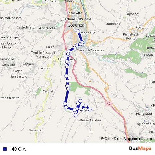 The first stop of the 140 C A bus route is Strada Provinciale 79dir - Dipignano and the last stop is Autostazione Cosenza - Cosenza. 140 C A is operational during tutti i giorni.