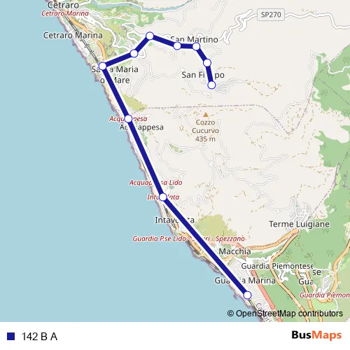 The first stop of the 142 B A bus route is Contrada San Filippo, 107 - Cetraro and the last stop is Strada Provinciale 34, 81 - Guardia Piemontese. 142 B A is operational during tutti i giorni.
