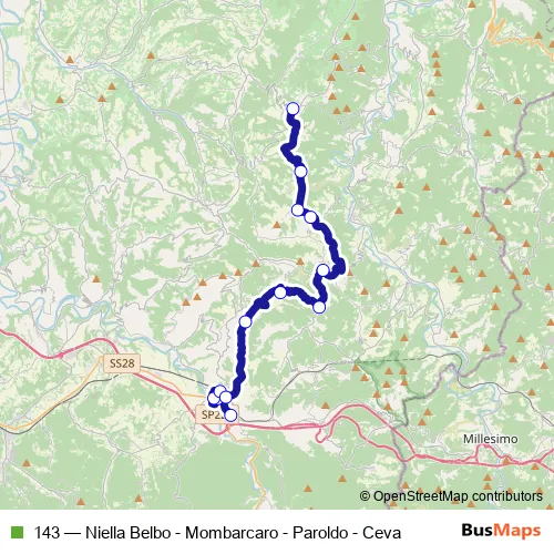 The first stop of the 143 bus route is Ceva - Stazione Ferroviaria and the last stop is Niella Belbo. 143 (Niella Belbo - Mombarcaro - Paroldo - Ceva) is operational during tutti i giorni.