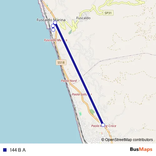 The first stop of the 144 B A bus route is Via Maggiore Alfonso Vaccari, 147 - Fuscaldo and the last stop is Strada Statale 18 Tirrena Inferiore-Piazzale Rione Croce - Paola. 144 B A is operational during tutti i giorni.