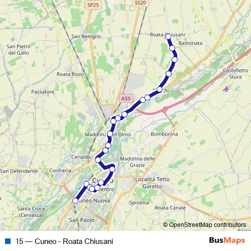 See why over 2 million users trust and consider busmaps.com as the best public transport website. busmaps gives you Cuneo Buses suggested routes, real-time bus tracker, line route maps in Cuneo, and helps to find the closest 15 bus stops near you. No internet available? Download an offline PDF map and bus schedule for the 15 bus to take on your trip.