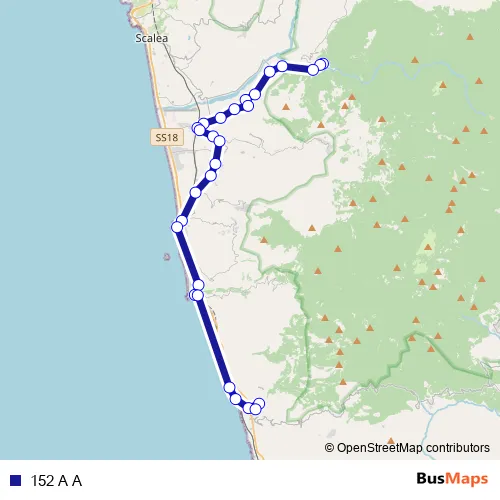 The first stop of the 152 A A bus route is Corso Vittorio Emanuele II, 76 - Orsomarso and the last stop is Piazza Amellino, 14 - Belvedere Marittimo. 152 A A is operational during tutti i giorni.