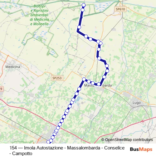 The first stop of the 154 bus route is Imola Autostazione and the last stop is Campotto DUE Ponti. 154 (Imola Autostazione - Massalombarda - Conselice - Campotto) is operational during tutti i giorni.