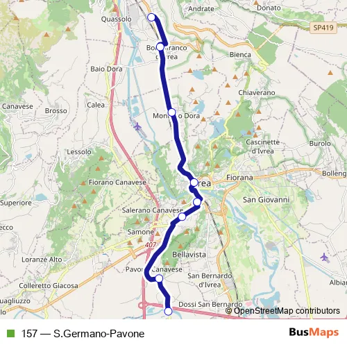 The first stop of the 157 bus route is SAN Germano and the last stop is Ponte Chiusella. 157 (S.Germano-Pavone) is operational during tutti i giorni.