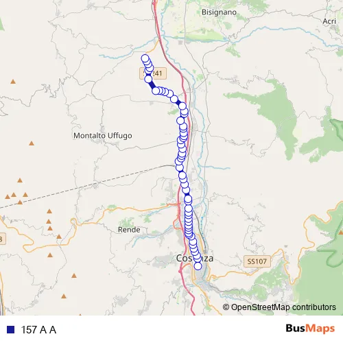 The first stop of the 157 A A bus route is Autostazione Cosenza - Cosenza and the last stop is Strada Statale 19 delle Calabrie, 20 - Lattarico. 157 A A is operational during tutti i giorni.
