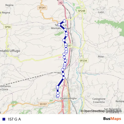 The first stop of the 157 G A bus route is Università della Calabria - Arcavacata - Rende and the last stop is Strada Provinciale 248 di Luzzi, 277 - Montalto Uffugo. 157 G A is operational during tutti i giorni.