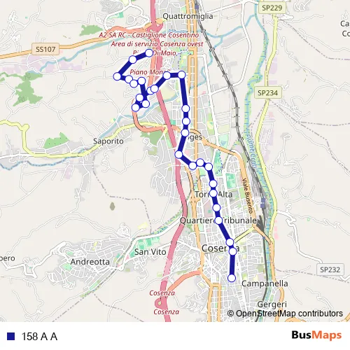 The first stop of the 158 A A bus route is Contrada Maio, 10 - Rende and the last stop is Autostazione Cosenza - Cosenza. 158 A A is operational during tutti i giorni.