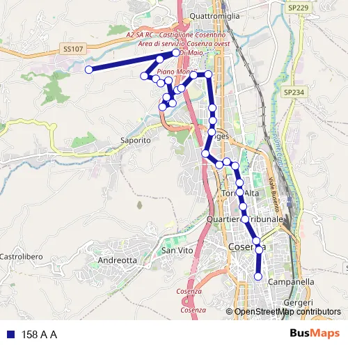 The first stop of the 158 A A bus route is Contrada Maio, 121 - Rende and the last stop is Autostazione Cosenza - Cosenza. 158 A A is operational during tutti i giorni.