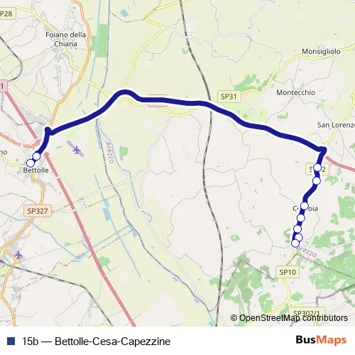 The first stop of the 15b bus route is Capezzine (Istituto Agrario) and the last stop is Bettolle Piazza Del Popolo. 15b (Bettolle-Cesa-Capezzine) is operational during nei giorni feriali.