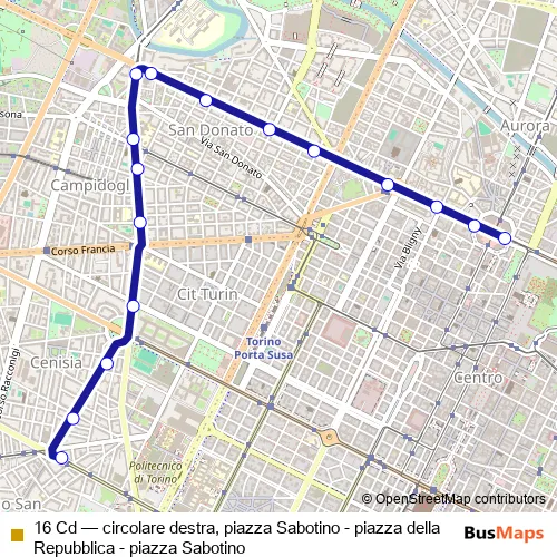 Tram 16 Cd - circolare destra, piazza Sabotino - piazza della Repubblica - piazza Sabotino in Turin: Stops & Timetable