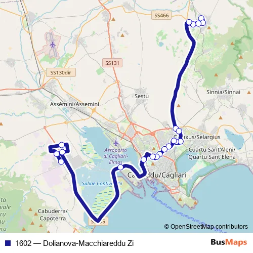 See why over 2 million users trust and consider busmaps.com as the best public transport website. busmaps gives you Cagliari Buses suggested routes, real-time bus tracker, line route maps in Cagliari, and helps to find the closest 1602 bus stops near you. No internet available? Download an offline PDF map and bus schedule for the 1602 bus to take on your trip.