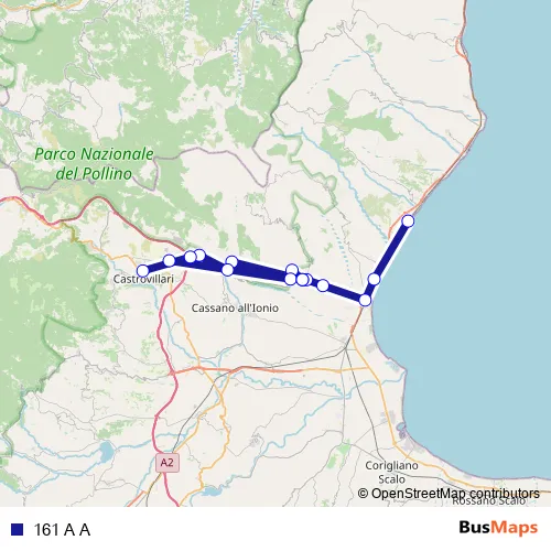 The first stop of the 161 A A bus route is Via Giotto, 3 - Trebisacce and the last stop is Piazzale della Stazione - Castrovillari. 161 A A is operational during tutti i giorni.