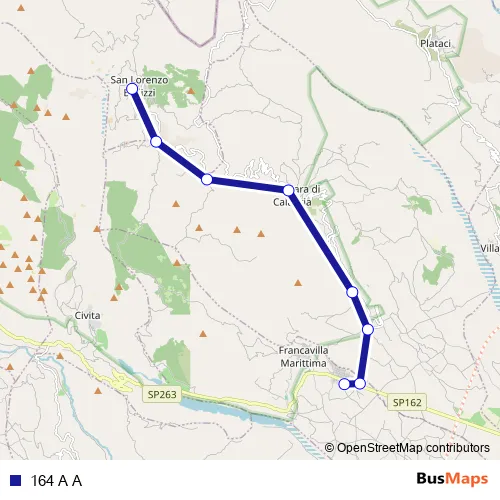 The first stop of the 164 A A bus route is Strada Statale 92, 17 - San Lorenzo Bellizzi and the last stop is Via Monsignor R. Barbieri, 4 - Francavilla Marittima. 164 A A is operational during tutti i giorni.