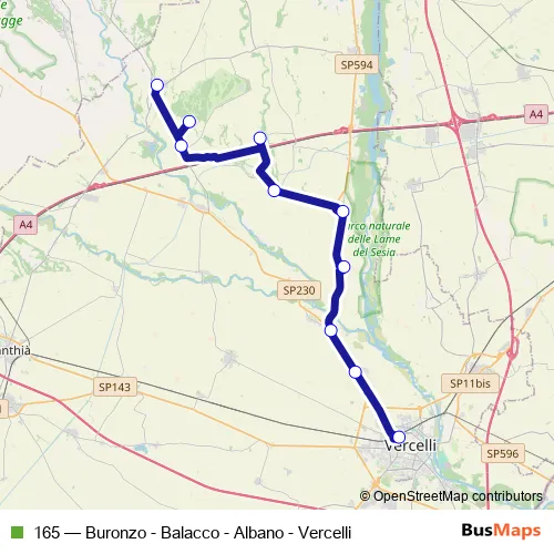 The first stop of the 165 bus route is Vercelli - Autostazione and the last stop is Buronzo - Piazza Cavour. 165 (Buronzo - Balacco - Albano - Vercelli) is operational during nei giorni feriali.