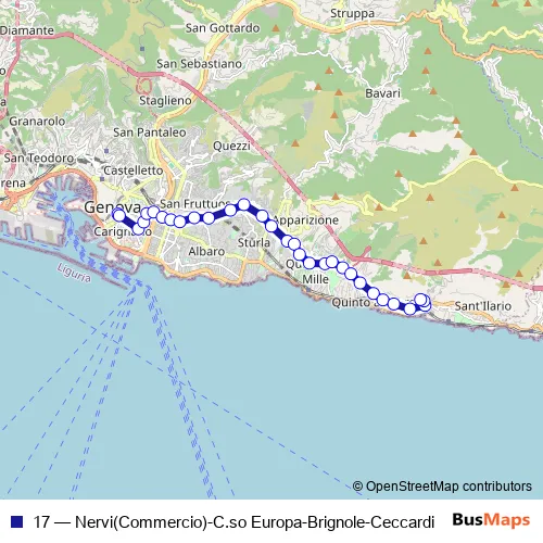The first stop of the 17 bus route is Ceccardi/Dante and the last stop is Commercio/Capolinea. 17 (Nervi(Commercio)-C.so Europa-Brignole-Ceccardi) is operational during tutti i giorni.