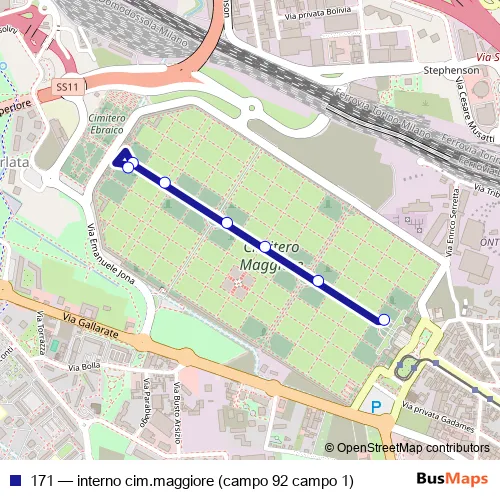 The first stop of the 171 bus route is interno cimitero maggiore and the last stop is interno cimitero maggiore. 171 (interno cim.maggiore (campo 92 campo 1)) is operational during nel fine settimana.