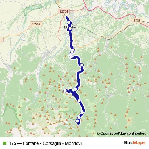 The first stop of the 175 bus route is Frabosa Soprana - Fontane and the last stop is Mondovi' - Stazione Ferroviaria. 175 (Fontane - Corsaglia - Mondovi') is operational during tutti i giorni.