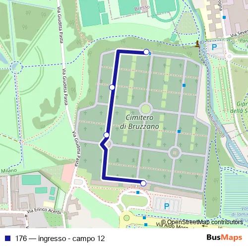 The first stop of the 176 bus route is interno cimitero bruzzano and the last stop is interno cimitero bruzzano. 176 (ingresso - campo 12) is operational during nel fine settimana.