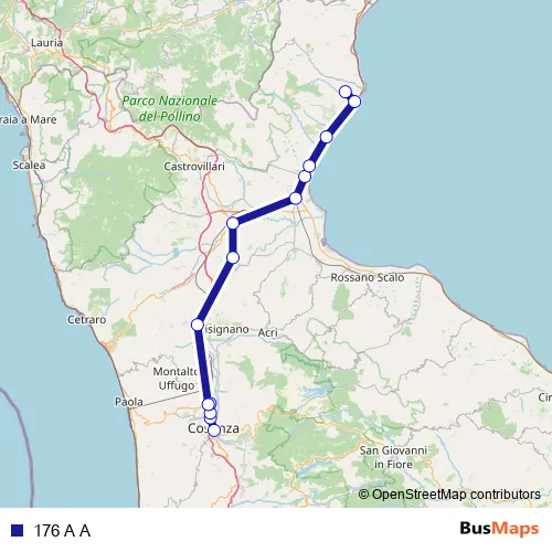 The first stop of the 176 A A bus route is Autostazione Cosenza - Cosenza and the last stop is Piazza Roberta Lanzino, 20 - Amendolara. 176 A A is operational during tutti i giorni.
