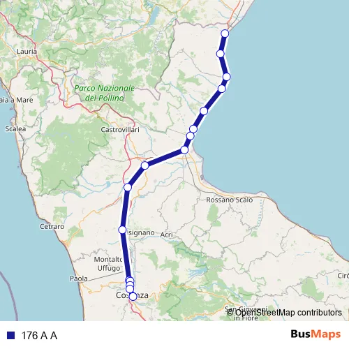 The first stop of the 176 A A bus route is Via Taranto, 1 - Rocca Imperiale and the last stop is Autostazione Cosenza - Cosenza. 176 A A is operational during tutti i giorni.